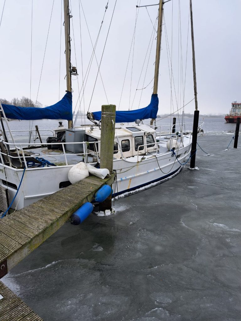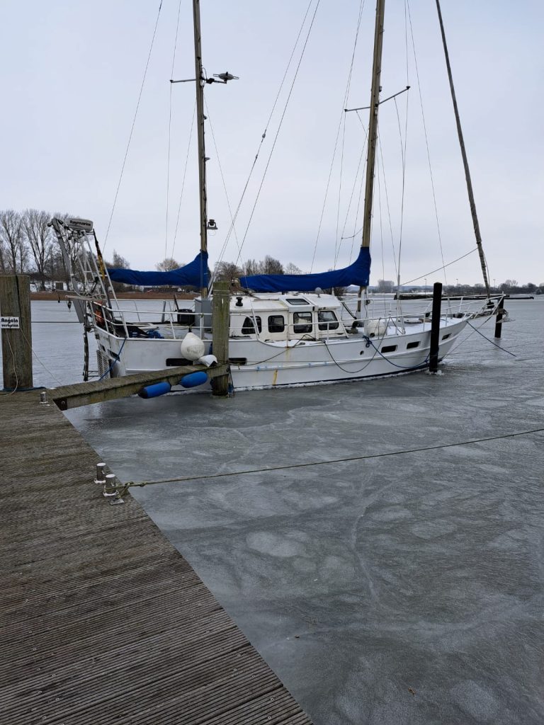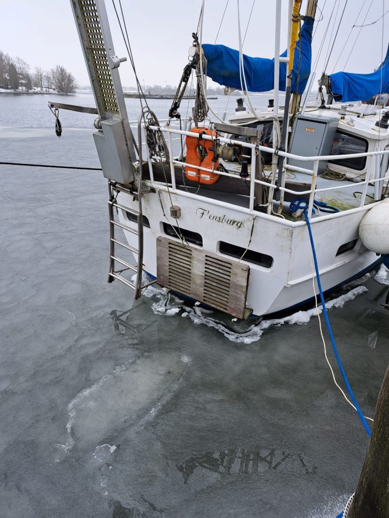 Im Eis gefangen wartet die NO Limits auf dringende Wartungsarbeiten. Ein „Landgang“ ist bereits geplant.